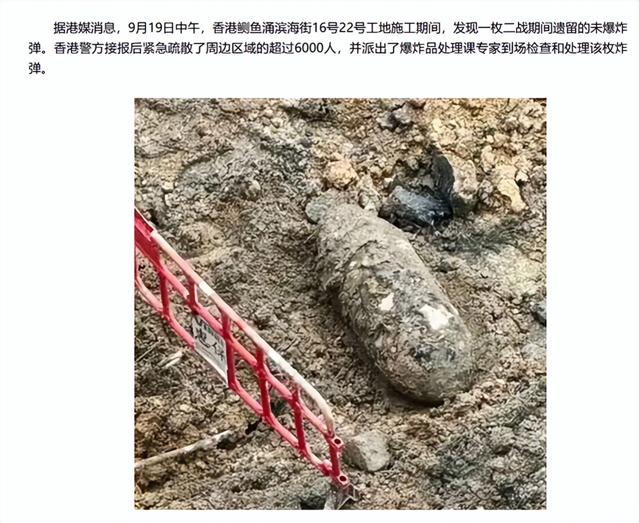 56. 2023年9月,香港某建筑工地施工过程中意外挖出一枚二战时期遗留未爆的航空炸 弹。