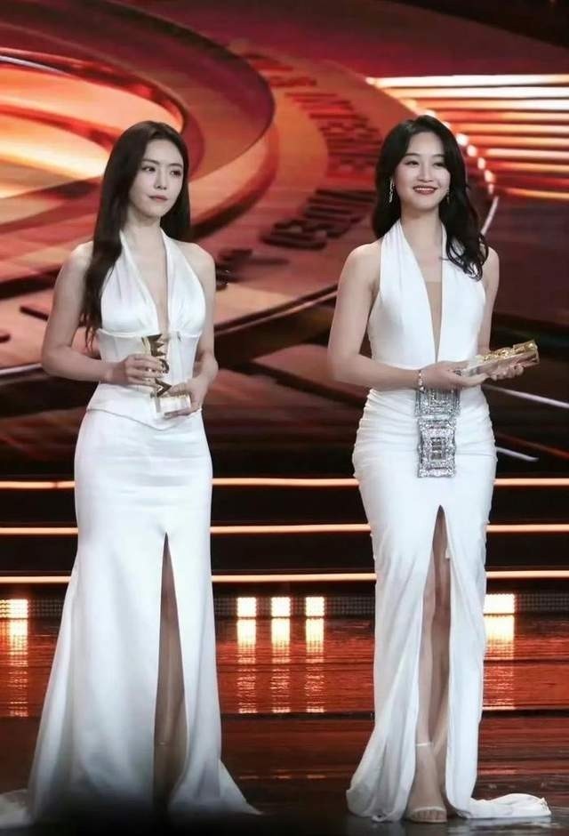 8. 2023年11月3日的微博视界大会上,蓝盈莹与蔡文静双双登台领奖,两人不约而同选择了白色深V设计礼服。